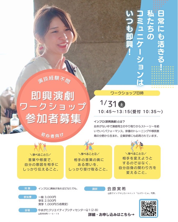 内容 【16歳以上対象】日常に生かす!コミュニケーションを楽しむインプロ(即興演劇)ワークショップ 「伝える・受け取る・関わり方を変える」をゲーム感覚で体験します。演技経験は不要 『私たちのコミュニケーションは、いつも即興。』 「インプロ(... -