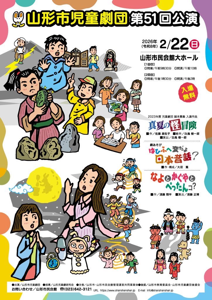 演目 「真夏の怪冒険」 作 佐藤美佐子 補作・演出 白鳥樹一郎 「はひふへ 変だよ日本昔話?」 作・演出 大沼篤 「なよとかぐやとぺったんコ?」 作 須藤翔平 演出 須藤正博 公演詳細 期間 2026年2月22日(日) 会場... -