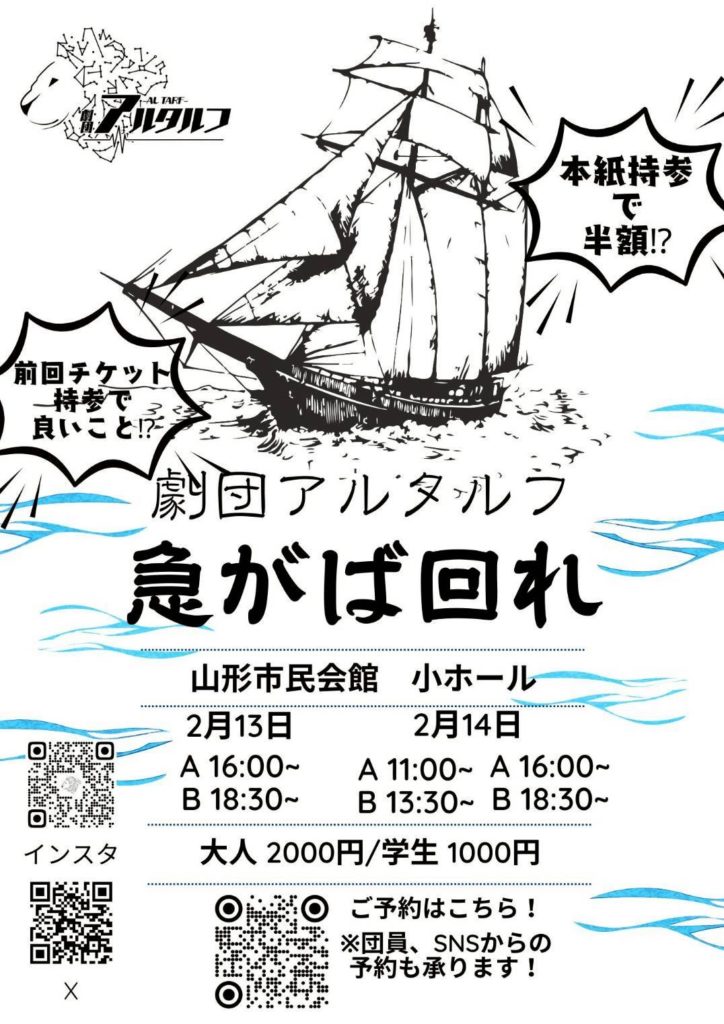 公演詳細 期間 2026年2月13日(金)〜14日(土) 会場 山形市民会館 小ホール 料金 【一般】2,000円【学生】1,000円 タイムスケジュール 2月13日(金) A 16:00 開演 B 18:30 開演 2月14日(土) A 11:00 開演 B 13:30&nb... -