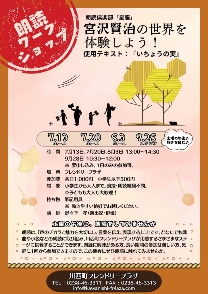 内容 ★使用テキスト:『いちょうの実』 朗読は、「声のチカラと魅力を大切にし、言葉を伝え、表現する」ことです。どなたでも戯曲や小説などの朗読に取り組み、川西町フレンドリープラザが用意するさまざまなステージに挑戦することができます。朗読に興味...