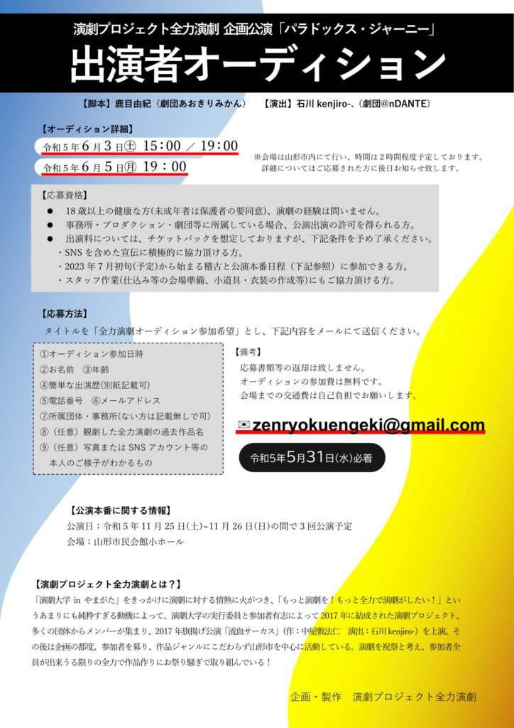 【オーディション】演劇プロジェクト全力演劇出演者募集オーディション