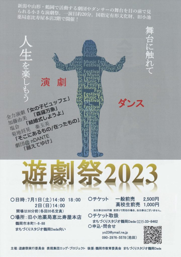 イベント概要 新潟や山形・鶴岡で活動する劇団やダンサーの舞台を目の前で見られる小さな演劇祭。1演目20分。国指定有形文化財、旧小池薬局恵比寿寿本店2階で開催! 公演詳細 期間 2023/7/1(土)~7/2(日) 会場 旧小池薬局恵比寿寿本店2階(山形県鶴岡市... -