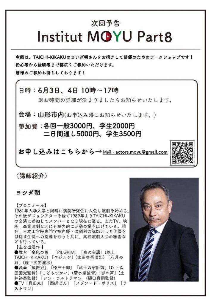 概要 今回は、映画やドラマ、舞台と幅広くご活躍されているTAICHI-KIKAKUのヨシダ朝さんをお招きして俳優のためのワークショップです! 1日目エチュード(インプロ)、2日目テキストワークの予定で開催いたします。 初心者から経験者まで幅広くご参加いただ... -