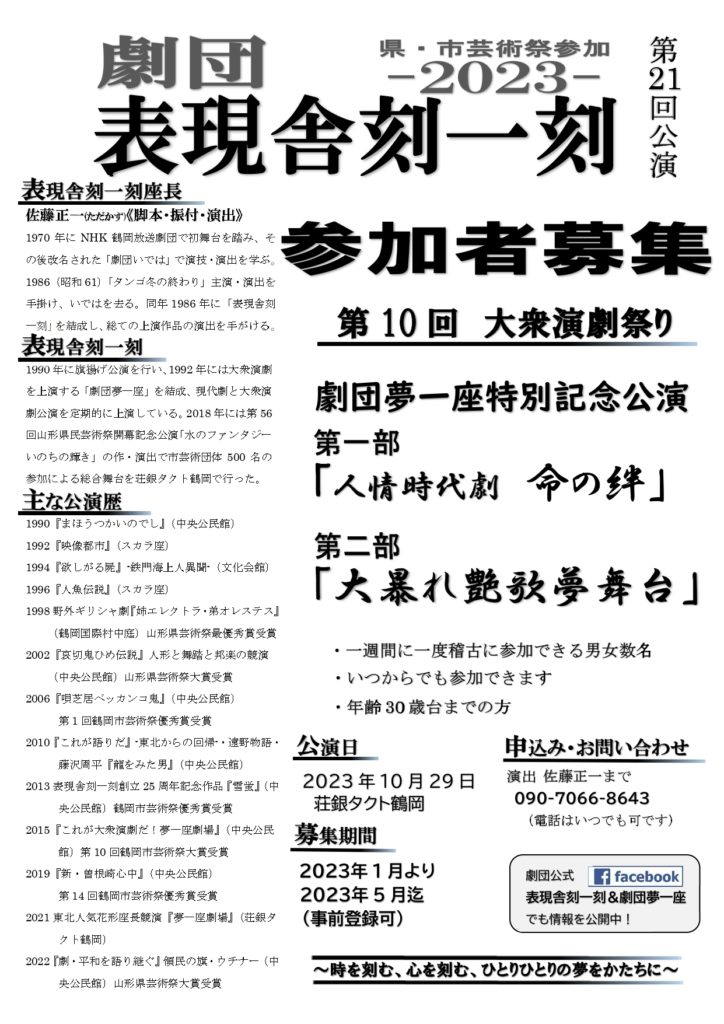 概要 2023年公演の参加者を募集いたします。 今年は10月29日(日) 荘銀タクト鶴岡において「第10回大衆演劇祭り 劇団夢一座特別記念公演」を上演予定です。 公演は2部構成で、第一部は人情時代劇、第二部は歌謡舞踊ショーとなります。 大衆演劇に出... -