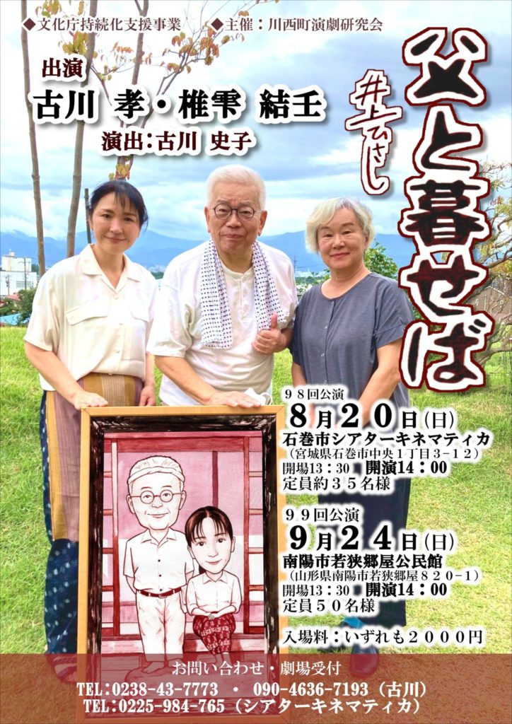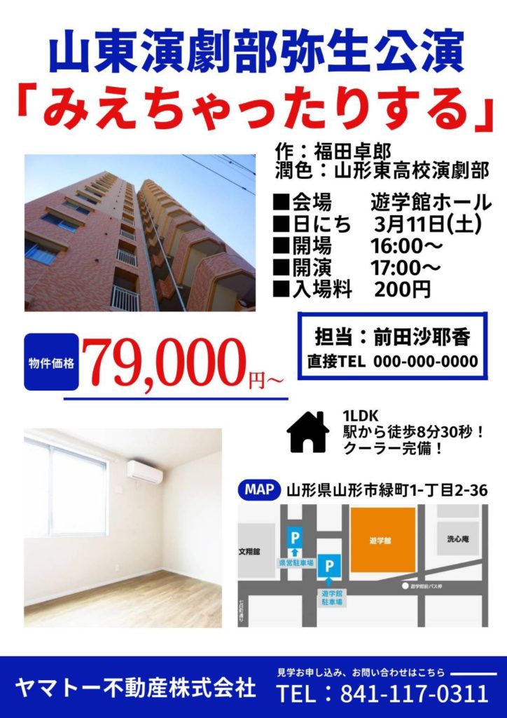 公演詳細 期間 2023年3月11日(土) 会場 遊学館 ホール 作 福田卓郎 脚色 山形東高校演劇部 料金 200円 タイムスケジュール 開場 16:30開演 17:00 -