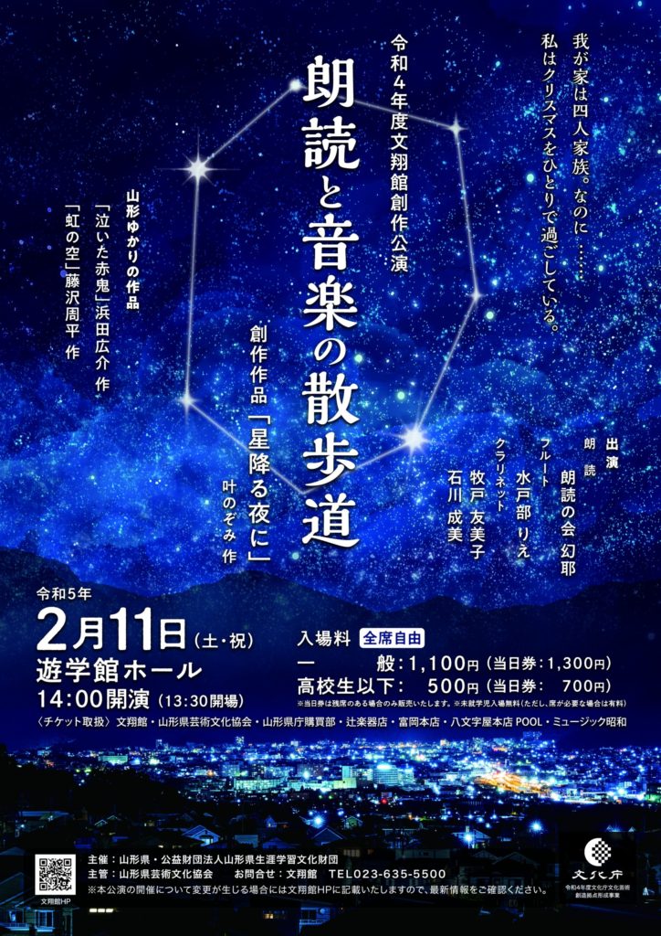 あらすじ 朗読の会幻耶による創作作品「星降る夜に」初演と山形ゆかりの作品をフルートとクラリネットの演奏と共におおくりします。 公演詳細 期間 2023年02月11日 会場 遊学館ホール 出演 朗読:朗読の会幻耶 フルート:水戸部りえクラリネット:牧戸友美... -