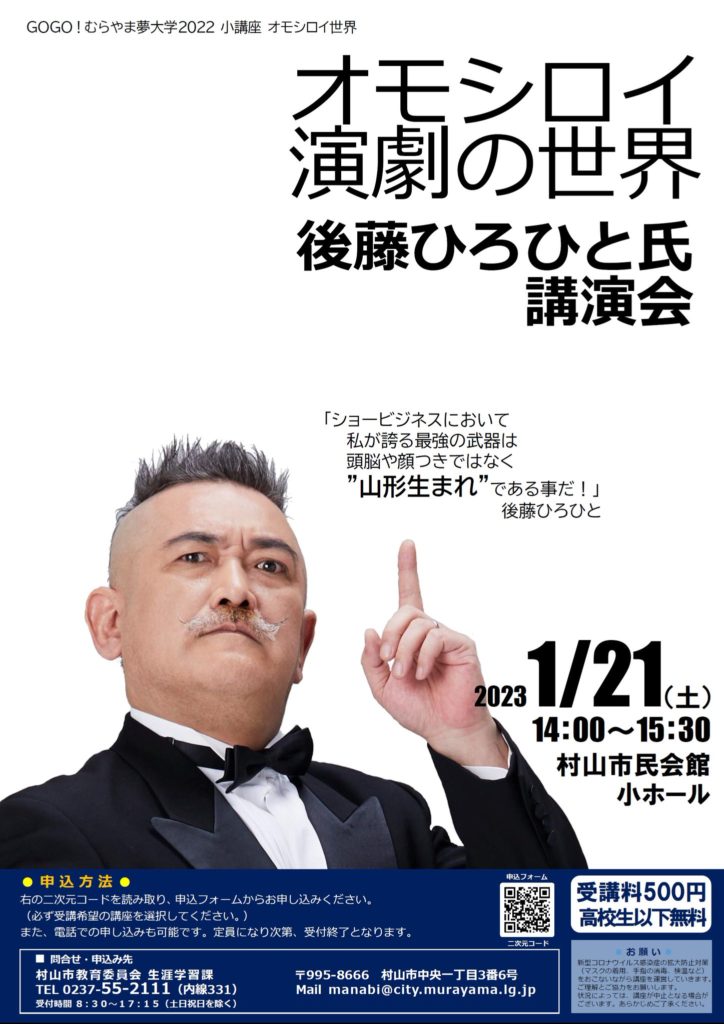 公演詳細 期間 2023年1月21日 講演時間 14:00 〜 15:30 会場 村山市民会館 小ホール 受講料 500円高校生以下無料 申し込み方法 申し込みフォームにてお申し込みください。※必ず受講希望の講座を選択してください。 お問合わせ 村山市教育委員会... -