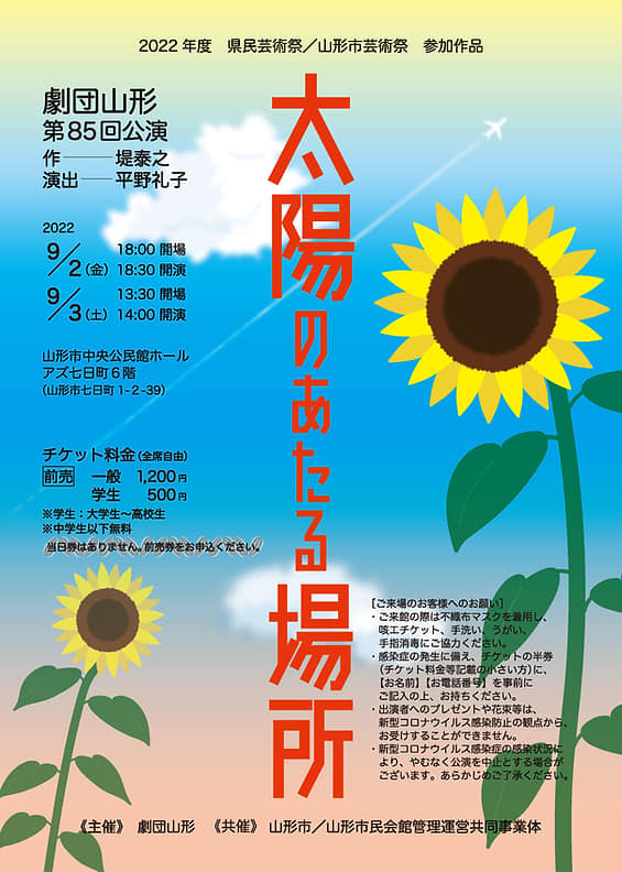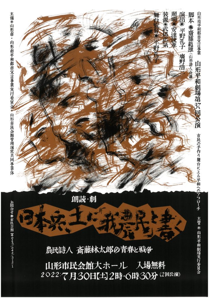 公演詳細 期間 2022年7月30日(土) 会場 山形市民会館 大ホール 脚本 齋藤範雄(山形詩人会議) 演出 平野礼子 廣野浩二 料金 入場無料 タイムスケジュール 7月30日(土)14:00・18:30(二回公演) お問合わせ 市民会館 TEL:023-642-3121 スタッ... -