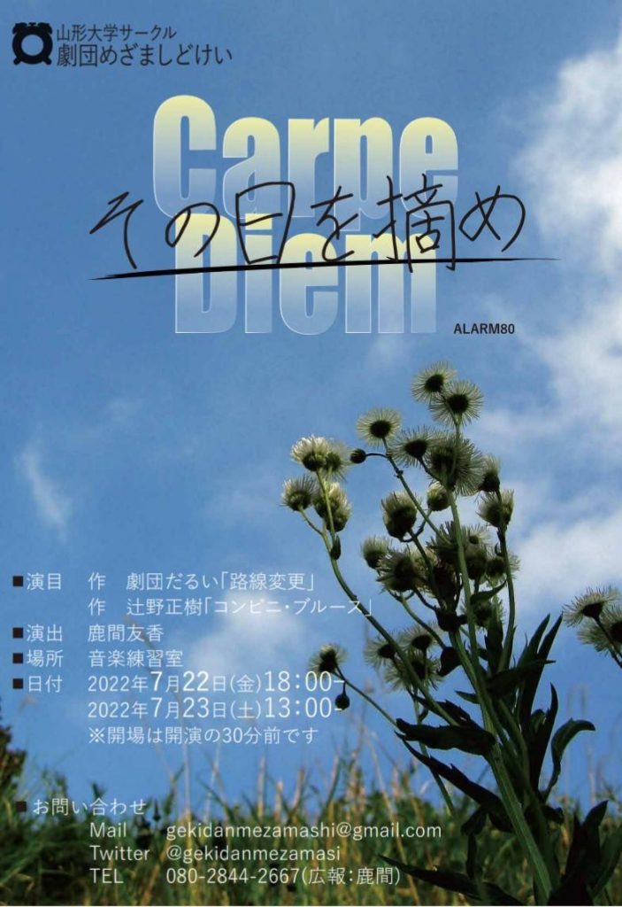 演目 作 劇団だるい「路線変更」 作 辻野正樹「コンビニ・ブルース」 公演詳細 期間 2022年7月22日(金)~7月23日(土) 会場 山形大学小白川キャンパス 音楽練習室 演出 鹿間友香 料金 200円 タイムスケジュール 7月22日(金)18:00〜7月23日(土)13:00〜 お... -