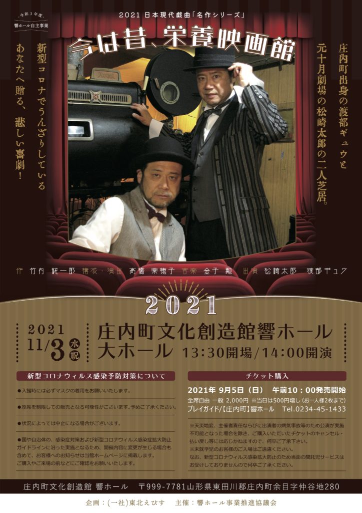 公演詳細 期間 2021年11月6日(土) 会場 鶴岡市中央公民館 市民ホール 作 菅原千鶴 演出 石川富志夫 料金 【一般】1,000円【中・高校生】500円【小学生以下】 無料 タイムスケジュール 11月6日(土) 昼の部:13:30〜 夜の部:18:30〜 ※開場は各30分前 ... -