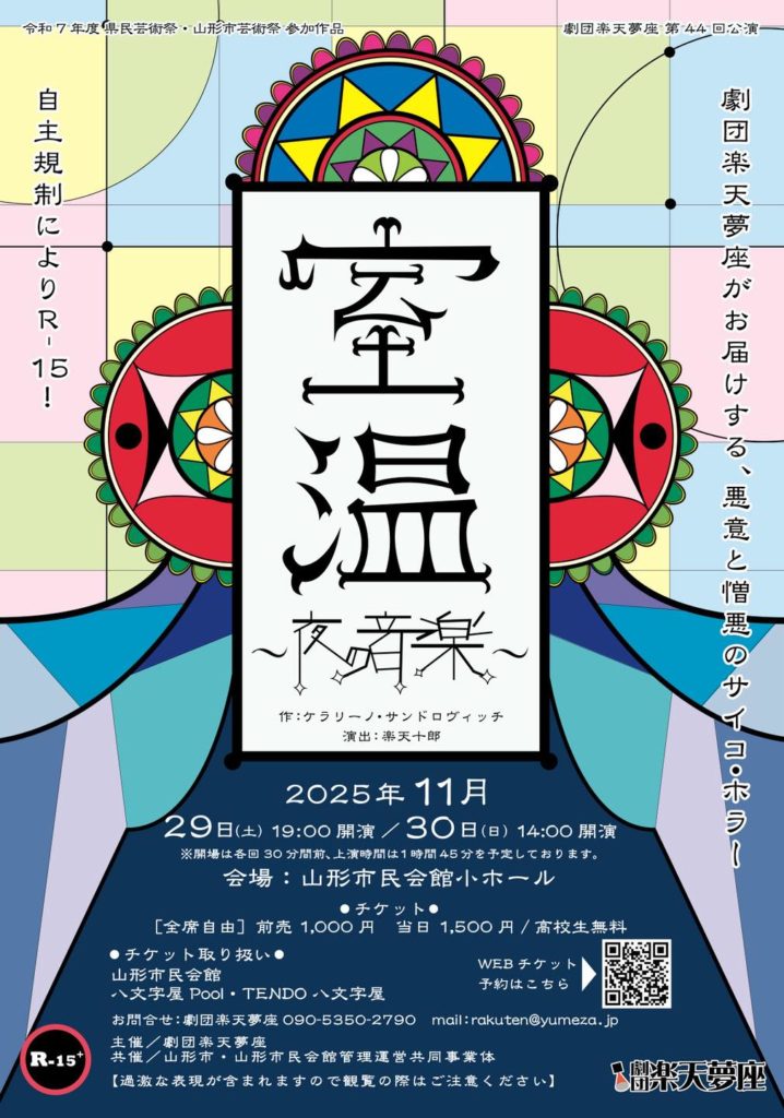 公演詳細 期間 2025年11月29日(土)~11月30日(日) 会場 山形市民会館 小ホール館 脚本 ケラリーノ・サンドロヴィッチ 演出 楽天十郎 料金 【前売】¥1,000/【当日】¥1,500 高校生無料 タイムスケジュール 29日(土) 19:00 開演 30日(日)&ems... -